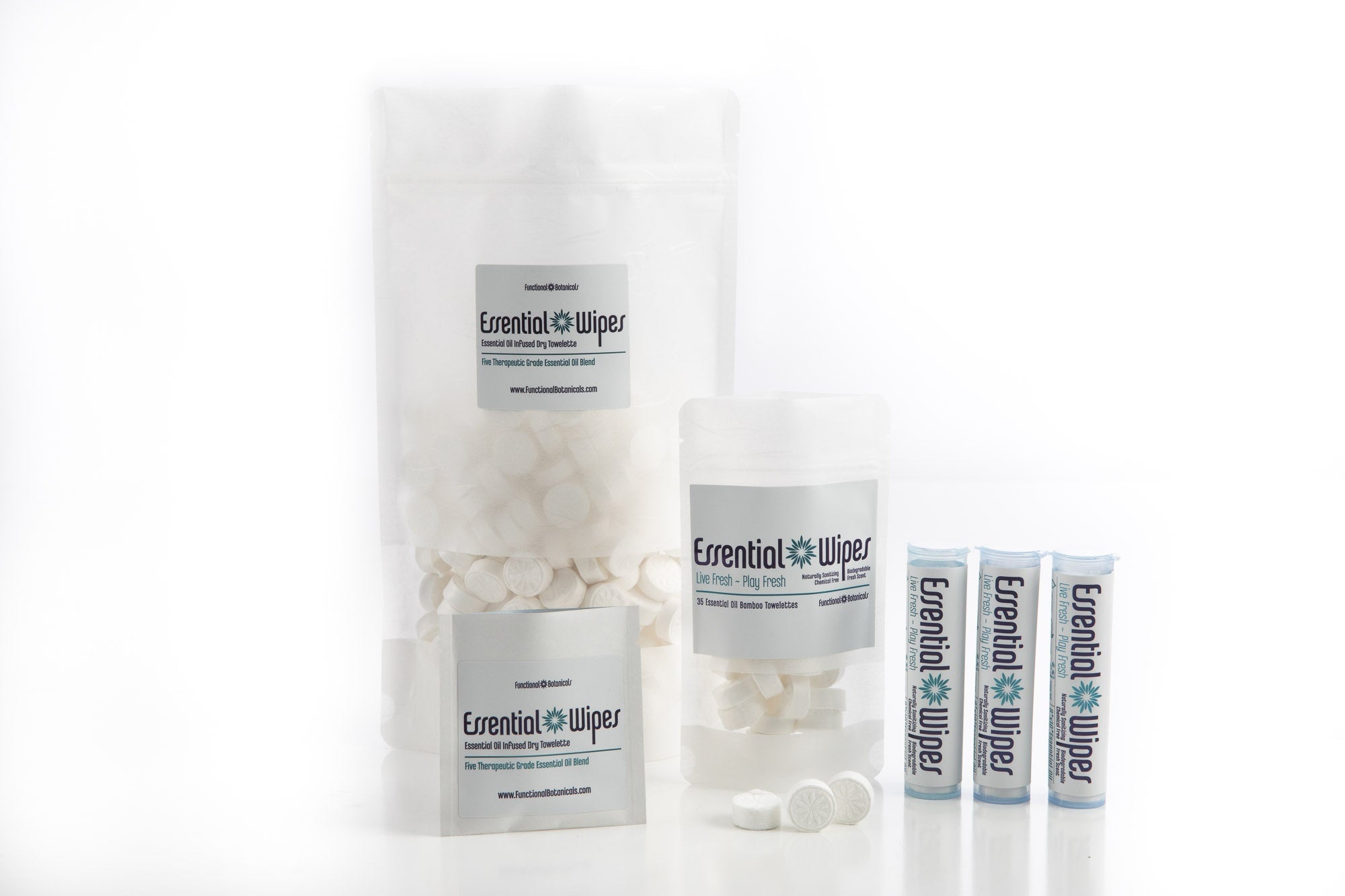 Functional Botanicals, Essential Wipes Eco Pak are 350 compressed bamboo tablets (about the size of a nickel) infused with organic therapeutic essential oils of Copaiba, Lavender, Niaouli, Ylang Ylang, and Palo Santo. The blend is naturally antiseptic while being moisturizing to the skin and smells radiantly refreshing. Add less than an ounce of water and they turn into an 8"x10" aromatic cleansing towelette. Compact and light, Essential Wipes are all natural, alcohol and preservative free and completely biodegradable, providing a pure and radiant aromatic experience.